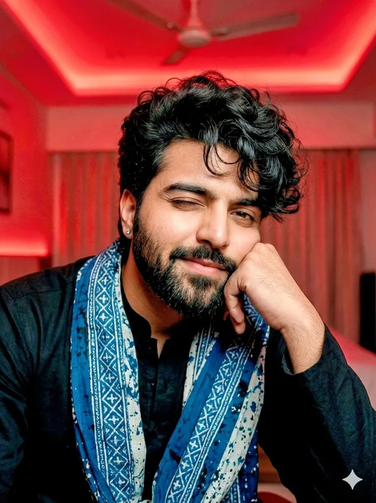 Clothing? Black kurta, patterned dupatta casually draped. Nothing flashy. Nothing costume-y. Just personal, modern, believable. Cinematic lighting and that crisp 85mm lens effect? Makes it feel intimate. Like… you could almost reach out and tap him on the shoulder. And yes, that smile? You can picture it in real life. That’s the vibe we’re going for.