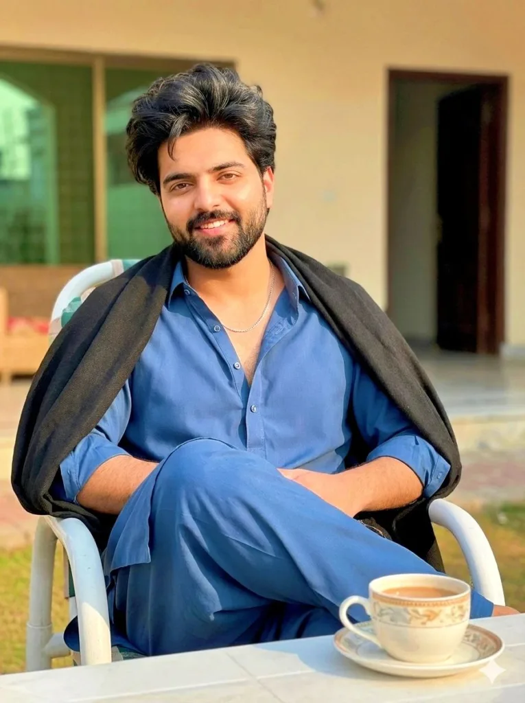 Use my face and create a pic of a stylish Pakistani man with same messy voluminized hair and trimmed beard, wearing a blue shalwar kameez (2 buttons open), a thin silver male necklace, and a black shawl draped on his shoulders. He is sitting in a white chair with a white table in front and tea on the table, sitting outside his home with legs crossed comfortably and a cute smile. Keep the face 100% the same as in the reference image.