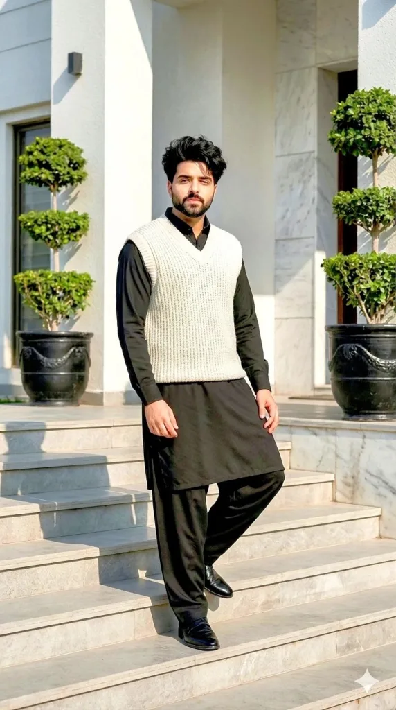 Wide pale stone steps. White stucco and marble building behind. Sculpted greenery on either side. He stands relaxed. Hands lightly touching. Confident, but not stiff. Black shalwar kameez under a creamy textured sweater vest. Black shoes finishing the look. Subtle. Sophisticated. Not trying too hard.