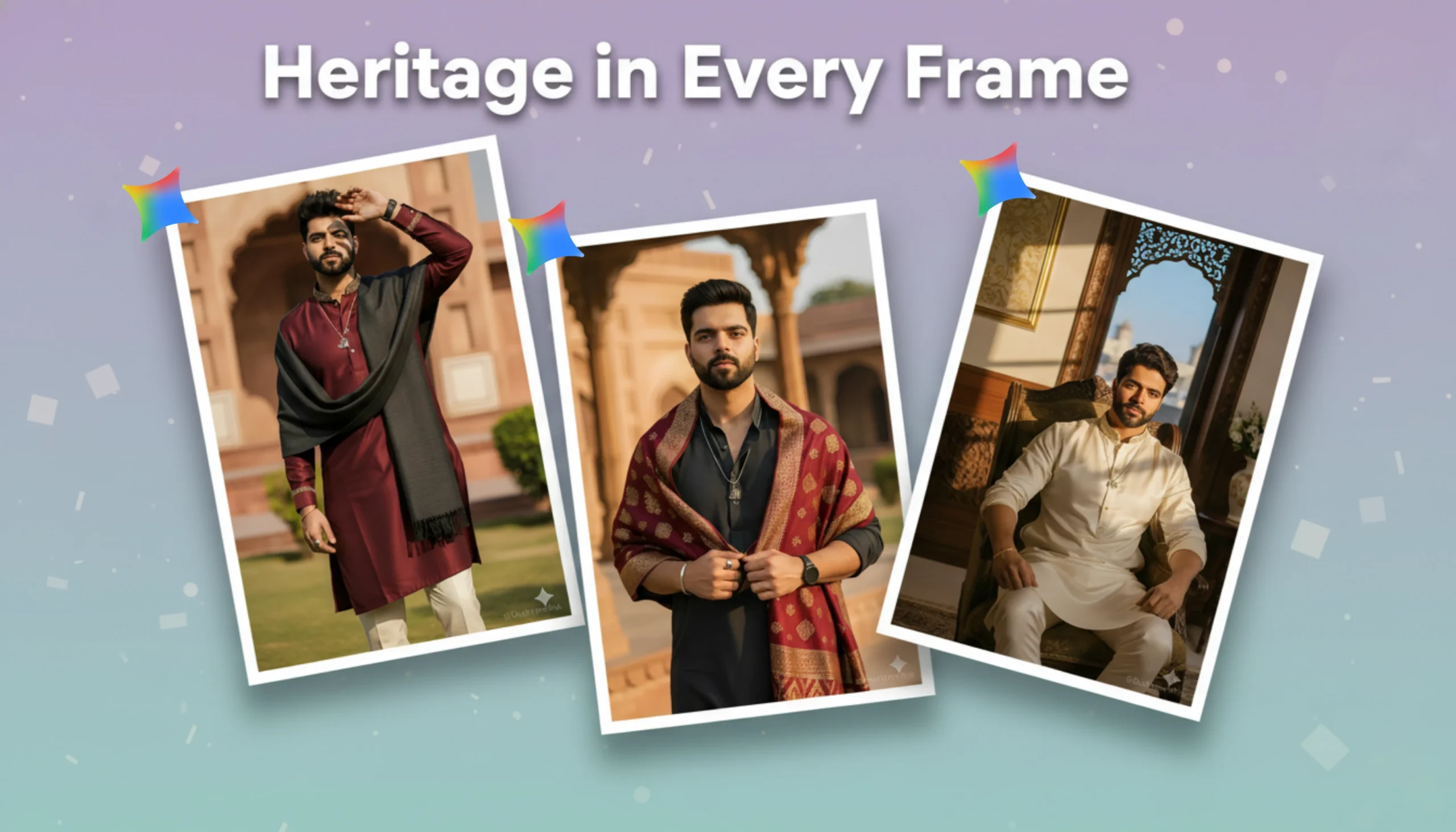 Background: a heritage outdoor setting — blurred elements of sandstone architecture, carved pillars, and distant greenery evoke the essence of Lahore’s royal courtyards or Mughal-inspired gardens. The tones are earthy and elegant, perfectly complementing his outfit and skin tone.