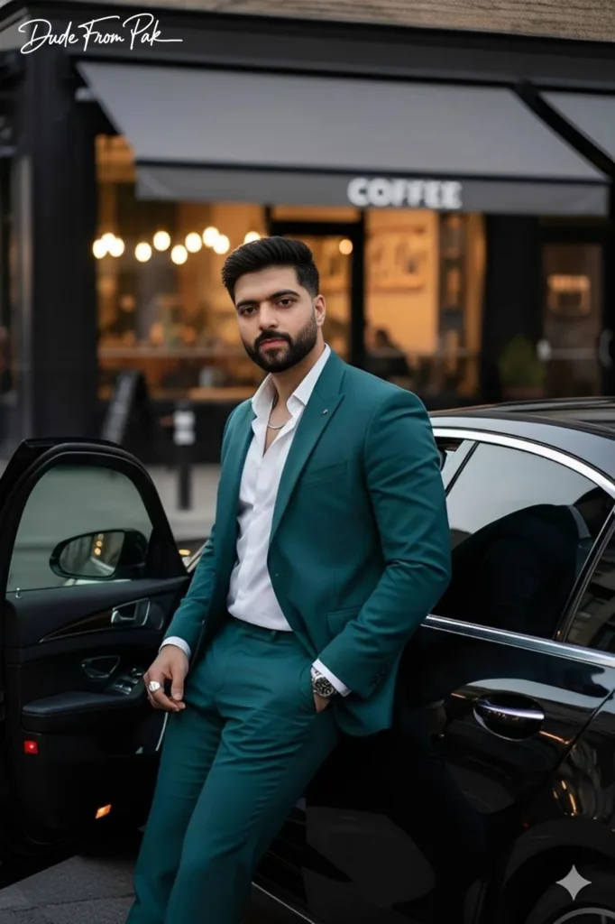 Ultra-realistic 8K cinematic photograph of the same young man, with face, hairstyle, and all features remaining 100% identical to the reference image, absolutely no changes to identity or appearance. He is leaning confidently against a sleek black luxury car with the door open, parked on an urban street at dusk. He is wearing a teal tailored suit with a white shirt unbuttoned at the chest, showing a silver chain, accessorized with multiple large silver rings. One hand rests casually in his pocket while the other lightly touches the car. In the background, there is a coffee shop with bright lights and an awning that says ‘COFFEE,’ softly glowing in the evening light. The mood is elegant, modern, and sophisticated, with warm natural lighting highlighting his face, outfit, and posture, while the urban street and car add a stylish, contemporary vibe. Cinematic depth of field, subtle reflections on the car, and realistic textures on clothing, skin, and surroundings.