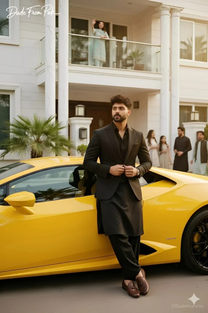 He stands leaning casually against a sleek yellow Lamborghini HuracΓ‘n, parked in front of a modern Pakistani bungalow with white marble pillars, glass railings, and potted palm plants.