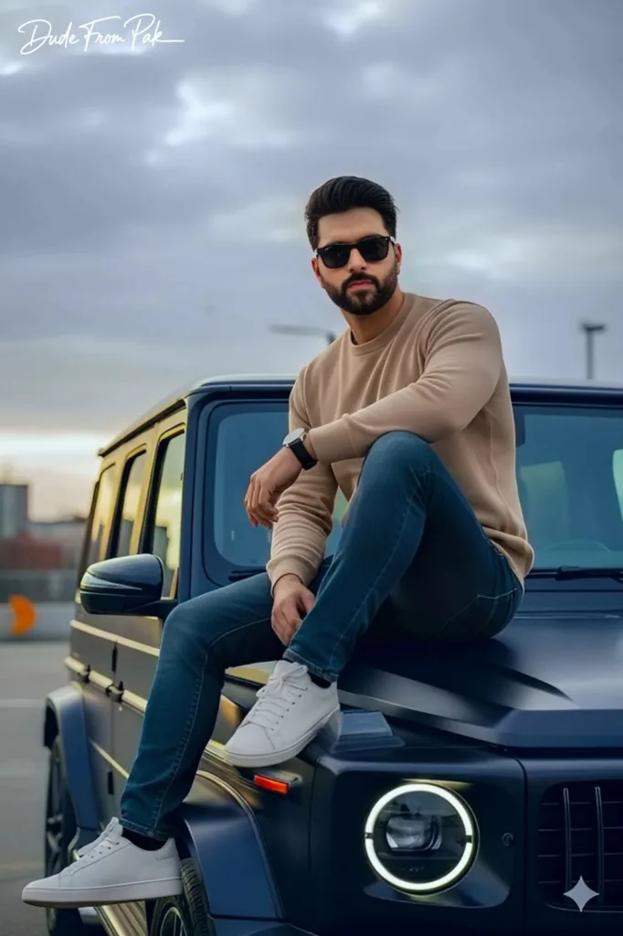 Create a cinematic image of a man perched on the roof of a Mercedes-AMG G63, dressed in a beige sweater, dark jeans, and white sneakers. The scene features lifelike lighting, rich textures, and editorial-quality realism, resulting in a stunning, professional AI portrait.