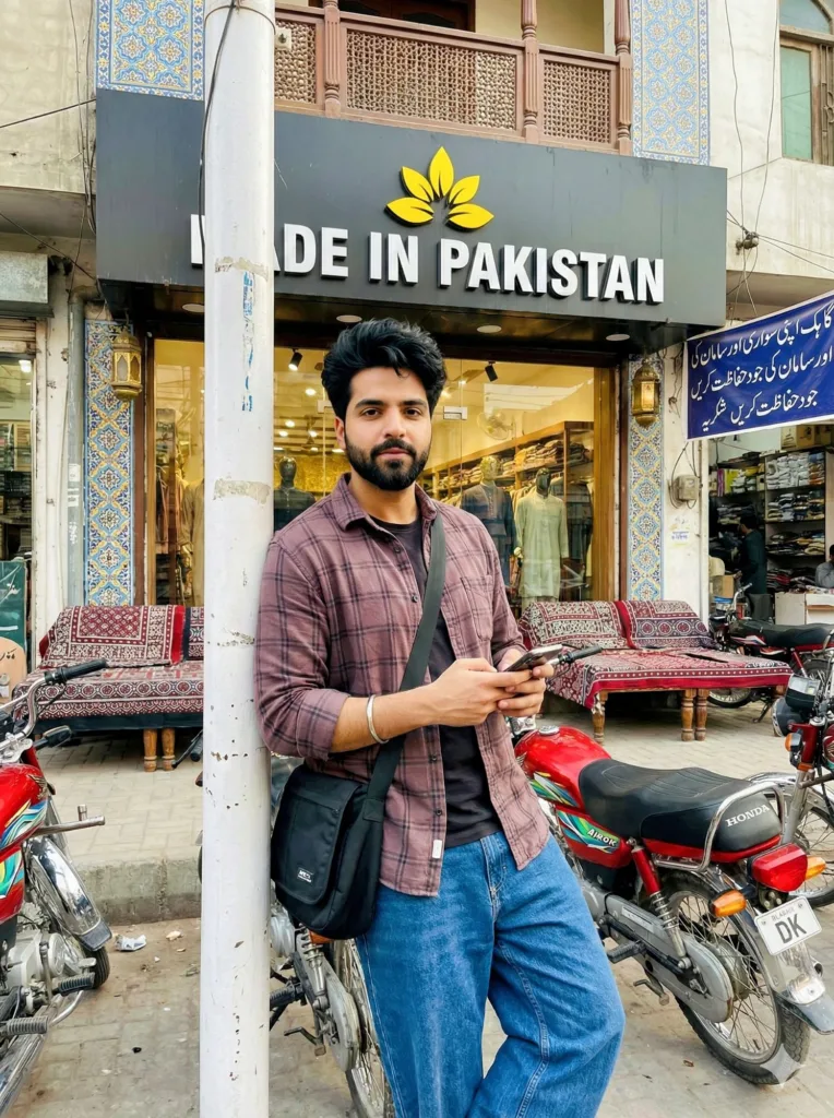 The background shows the front of a clothing store named “MADE IN PAKISTAN” in Multan city of Pakistan. A large black storefront sign with a yellow leaf logo is clearly visible across the facade. The building has a modern white and dark gray exterior with hanging green plants from the second-floor balcony. The building features a façade of weathered red brick and warm terracotta tiles, accented with deep sheesham wood jali screens on the second-floor balcony, through which drapes of richly embroidered fabrics flow gently in the breeze. A grand, arched entryway, reminiscent of Mughal architecture, is framed by vibrant Multani blue-and-white tile work.