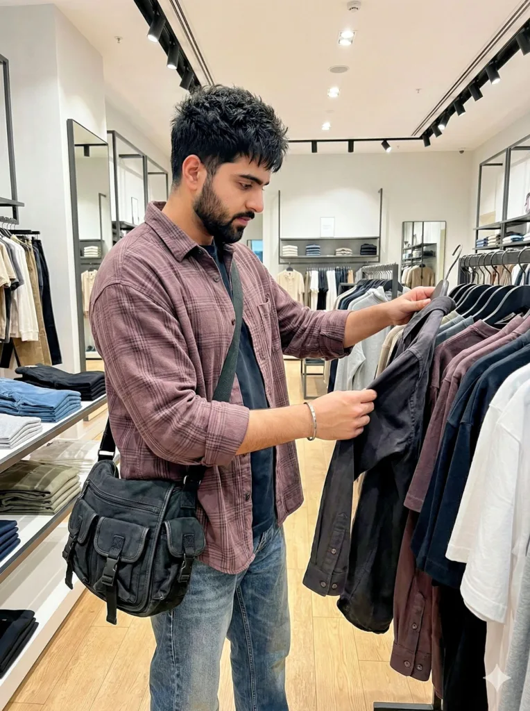 He is inside a modern clothing shop, standing beside a neatly organized dress rack. He slides one hanger forward and checks the fabric with his fingers, inspecting quality and stitching. Relaxed buyer behavior, natural posture, not posing, attention focused on the garment.