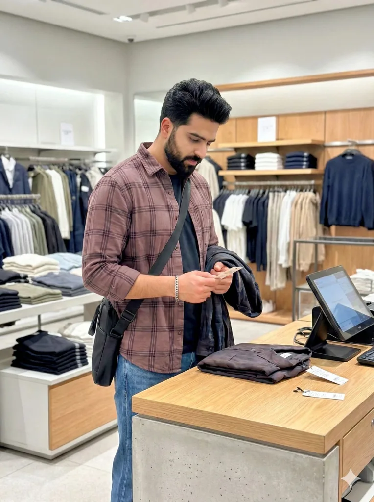 He stands at a modern checkout counter inside the clothing shop, holding a selected dress folded over his forearm while checking the price tag. Natural decision moment, calm and confident expression.