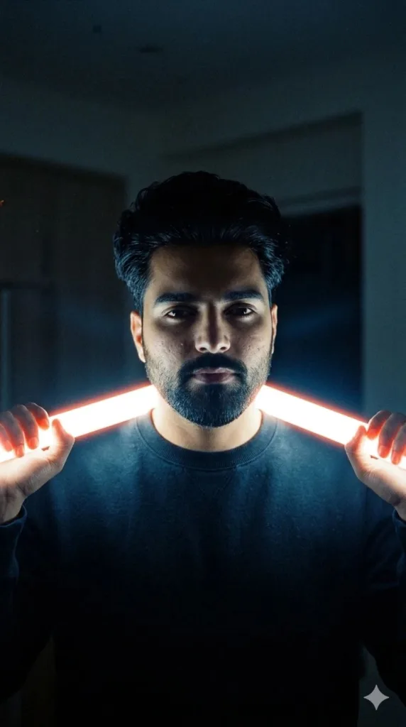 Ultra-realistic 35mm film portrait of young South Asian male (hard identity reference), exact facial structure, jawline, nose, eyes, hairline, natural asymmetry; medium warm-brown skin with visible pores; standing in dark indoor space holding glowing LED tube behind shoulders, loose dark sweatshirt with natural folds; strong rim light with halation on hair, shoulders, hands; face partially shadowed, soft spill, moody low-key exposure; slight micro-movement in hands, calm introspective expression, eyes slightly off-camera; minimal background, faint walls visible; Cinestill 800T film grain, edge softness, mild chromatic aberration, cool blue shadows, warm tungsten highlights; candid, unposed, intimate; no CGI, no HDR, no beauty filters, no digital smoothing, no glasses, real scanned film look –ar 9:16 –style raw –v 6