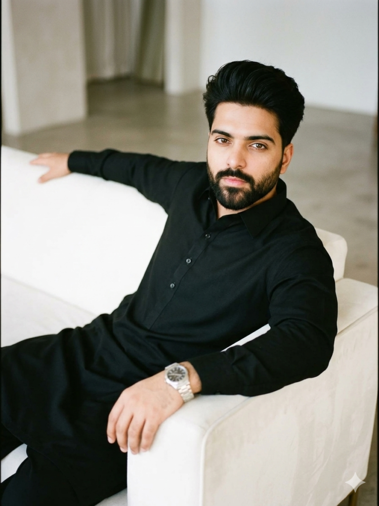 Ultra-realistic analog film portrait of a young South Asian male, using the uploaded reference image as hard identity anchor; lounging casually on a white velvet sofa in a modern studio, upper body to torso visible, slightly angled relaxed posture, left wristwatch visible, subtle micro-movements in hair and fabric; medium warm-brown skin with visible pores and natural tonal variation; perfectly tailored black shalwar kameez, classic formal shoes; soft diffused studio lighting mimicking daylight, natural shadows, gentle highlight roll-off; background neutral and softly blurred, minimal aesthetic; Kodak Portra 400 film rendering with warm, natural skin tones, subtle grain texture, muted black fabric, no glasses, no digital grading; no beautification, no CGI, no HDR, no digital sharpness, authentic scanned film feel –ar 9:16 –style raw –v 6