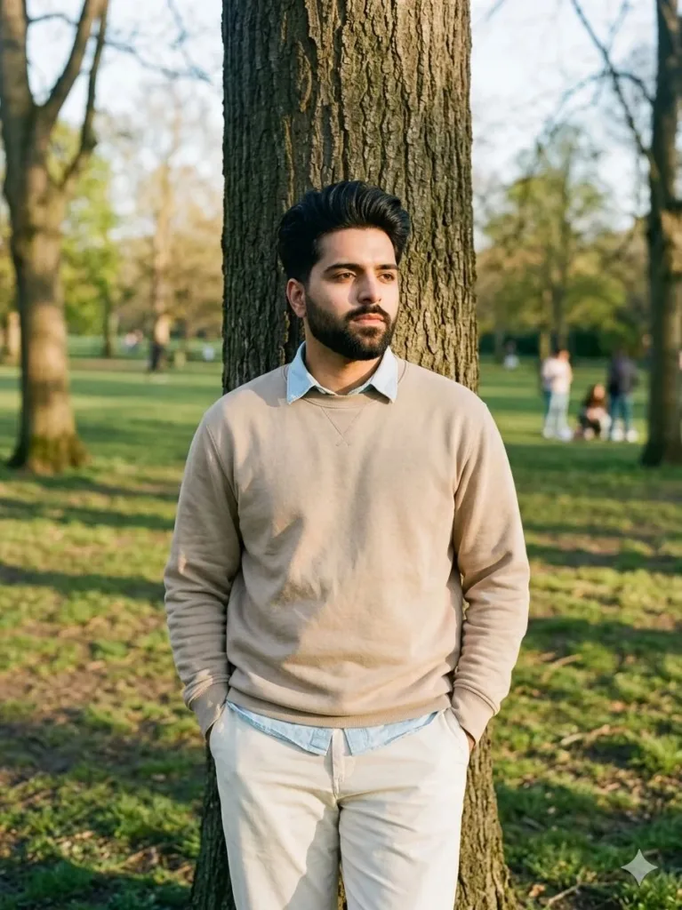 Ultra-realistic 35mm analog film portrait of a young South Asian male, using uploaded reference image as hard identity anchor; exact facial structure, jawline, nose, eye spacing, hairline, and natural asymmetry preserved; medium South Asian skin tone with visible pores and natural tonal variation; leaning casually against a large tree in a sunlit park during golden hour, hands in pockets, relaxed posture, slight micro-movement in fabric; expression neutral to contemplative, looking slightly off to the side; beige sweatshirt layered over light blue collared shirt, cream trousers, natural fabric folds; golden hour sunlight casting warm directional light and long shadows, soft highlight bloom, detailed shadows; background includes uneven grass, scattered trees, and a few softly out-of-focus distant people; subtle film grain, slight edge softness, natural depth of field, Portra 400 rendering with warm highlights, muted greens, and gentle color shifts; candid, observational, unposed composition, slight asymmetry in scene; no beautification, no CGI, no HDR, no artificial skin smoothing or digital sharpness, no glasses, authentic scanned film feel –ar 9:16 –style raw –v 6