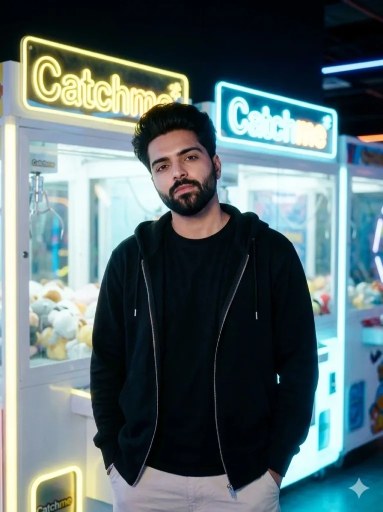 Ultra-realistic 35mm film portrait of young South Asian male (hard identity reference), exact facial features, jawline, nose, eyes, hairline, natural asymmetry; medium warm-brown skin with visible pores; standing in front of arcade claw machines labeled “Catchme,” glowing neon yellow and cool blue lights; black zip-up hoodie over black t-shirt, light-colored pants; hands casually in pockets, slight head tilt, calm expression; soft halation and bloom from neon reflections, subtle motion in fabric/hair; fine film grain, edge softness, slight chromatic aberration; authentic skin texture, no CGI, no HDR, no beauty filters, no digital smoothing, no glasses, real scanned Cinestill 800T look –ar 9:16 –style raw –v 6