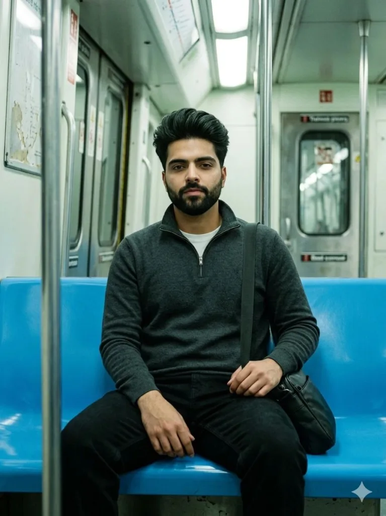 Ultra-realistic 35mm film portrait of young South Asian male (hard identity reference), exact facial features, jawline, nose, eyes, hairline, hairstyle, natural asymmetry; medium warm-brown skin with visible pores and tonal variation; seated casually on bright blue subway seat, dark grey quarter-zip sweater over white shirt, black straight-fit jeans, black shoulder bag naturally at side; soft overhead fluorescent lighting with slight green-blue cast, gentle shadows, subtle bloom on reflective surfaces; moderate depth-of-field, visible film grain, edge softness, mild chromatic imperfections; unposed, calm neutral expression, natural posture, micro-tension in slouch; authentic urban subway carriage with metallic poles, train doors, signage, minor wear, subtle imperfections; Fuji Superia 400 look cool-leaning tones, muted saturation, soft contrast, natural color shifts; no HDR, no digital smoothing, no CGI, no beauty filters, resembles real scanned film photo, no glasses –ar 9:16 –style raw –v 6