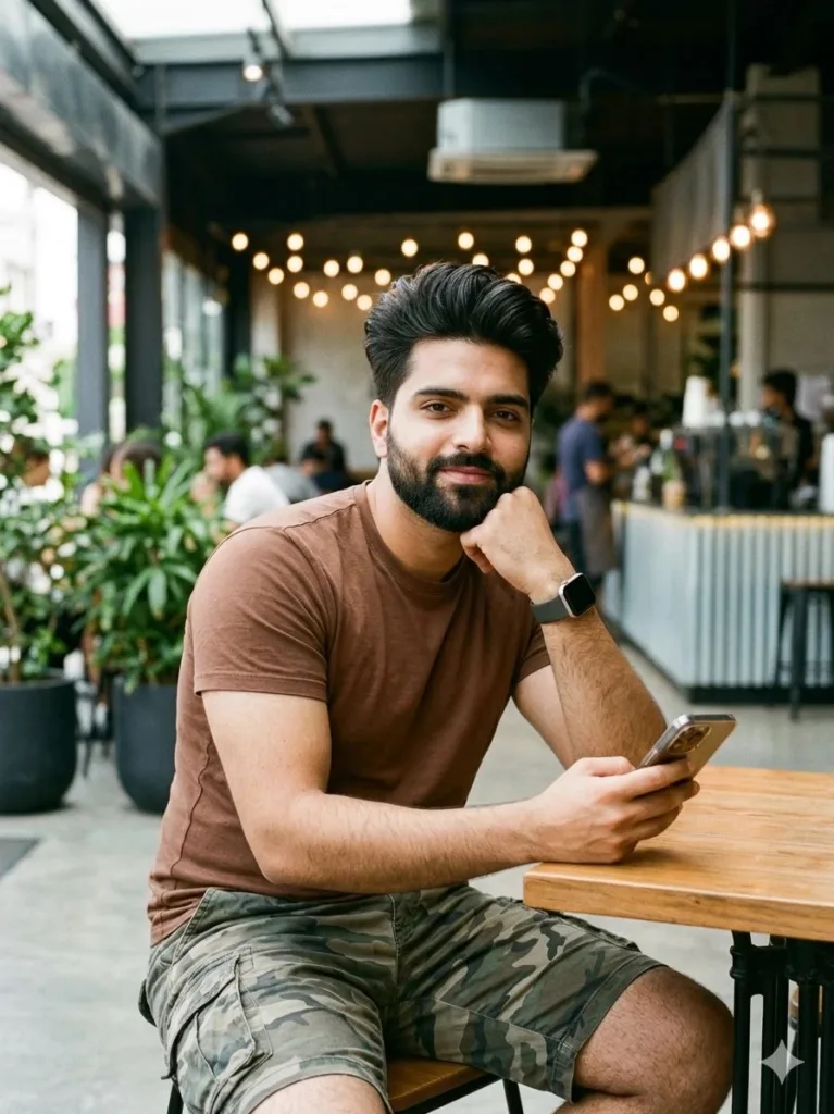 Ultra-realistic 35mm film portrait of young South Asian male (hard identity reference), exact facial features, jawline, nose, eyes, hairline, hairstyle, natural asymmetry; medium warm-brown skin with visible pores and tonal variation; seated casually in open-air café with greenery, leaning slightly forward, one elbow on knee, hand supporting chin, other hand holding smartphone; fitted brown t-shirt, camouflage cargo shorts, black round glasses, smartwatch on wrist; mixed natural daylight and warm ambient café lighting, soft directional highlights, gentle shadowing; moderate optical shallow depth-of-field, soft background falloff, visible fine film grain, slight edge softness, mild chromatic imperfections; relaxed candid posture, faint natural smile, micro-movements in fabric and hair; modern café with industrial and tropical elements, mild clutter, lived-in realism; Kodak Gold 200 color response warm golden highlights, slightly muted greens, gentle contrast, subtle imperfections; no HDR, no digital smoothing, no CGI, no beauty filters, resembles real scanned film photo, no glasses –ar 9:16 –style raw –v 6
