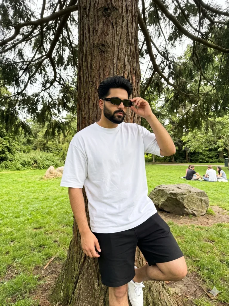 Outfit: plain white oversized t-shirt, black shorts, white sneakers—all with realistic fabric folds and natural fit. No glasses.