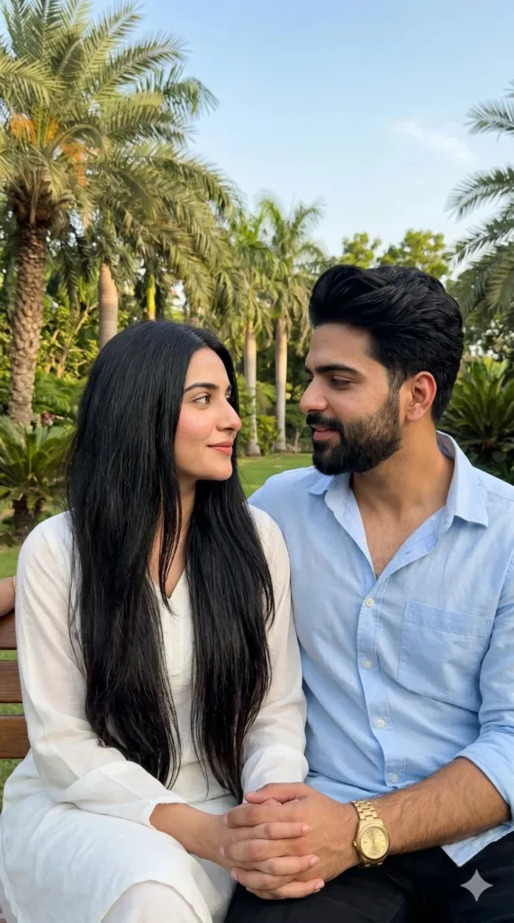 Pakistani couple with exact preserved facial identity sitting close together: man turned toward the woman with a soft confident smile, wearing a light blue open-collar cotton shirt with subtle fabric texture catching light, gold wristwatch, no glasses; woman facing him with warm tender gaze and slight smile, long thick straight black hair flowing over shoulders, wearing a minimal white outfit partially visible, rich natural skin tone with soft glow.