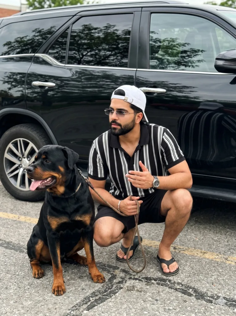 The Rottweiler sits beside him in a natural, unposed way—body slightly angled, head mid-turn, tongue partially out. Strong muscular build with detailed, slightly uneven fur texture.