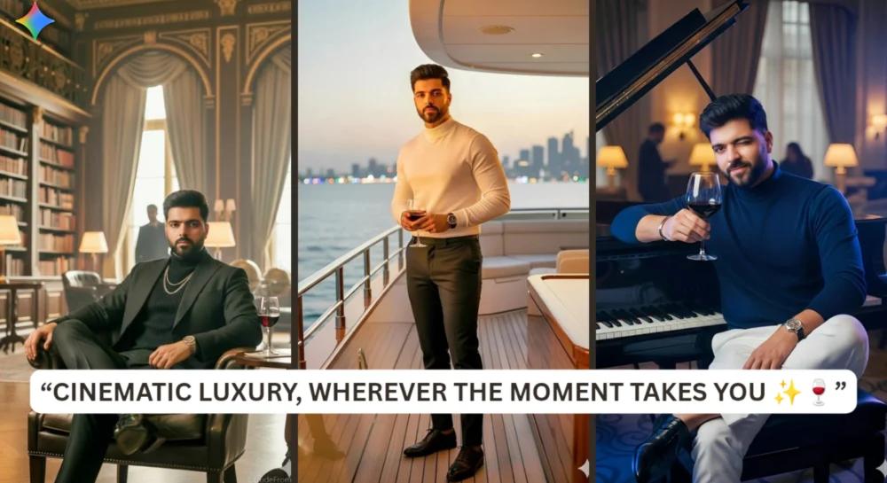 Immerse yourself in a realm of exquisite elegance and contemporary sophistication with this series of ultra-realistic 8K cinematic portraits. From the whimsical allure of a wink and a raised wine glass next to a sleek grand piano, to the timeless grace found among golden-lit bookshelves in an opulent library, and culminating in enchanting high-end lifestyle moments aboard a sunset-kissed yacht, each scene radiates luxury, confidence, and editorial artistry. Every aspect, from tailored outfits and refined accessories to cinematic lighting and ambient reflections, crafts visually stunning imagery that is perfect for Instagram and magazines. This is a tribute to style, ambiance, and cinematic storytelling across environments that epitomize modern luxury.