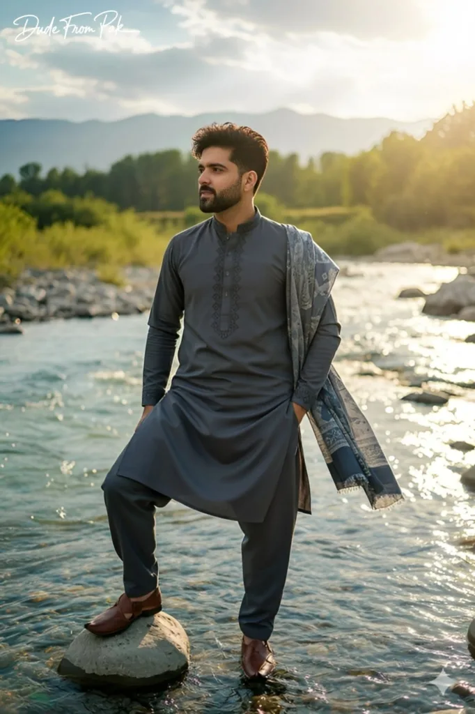 He wears a modern Pakistani outfit: a fitted charcoal-grey kurta with subtle embroidered details on the collar and cuffs, paired with tailored dark shalwar, and traditional brown khussa shoes with natural texture. Optional: a lightweight shawl draped casually over one shoulder for storytelling flair.