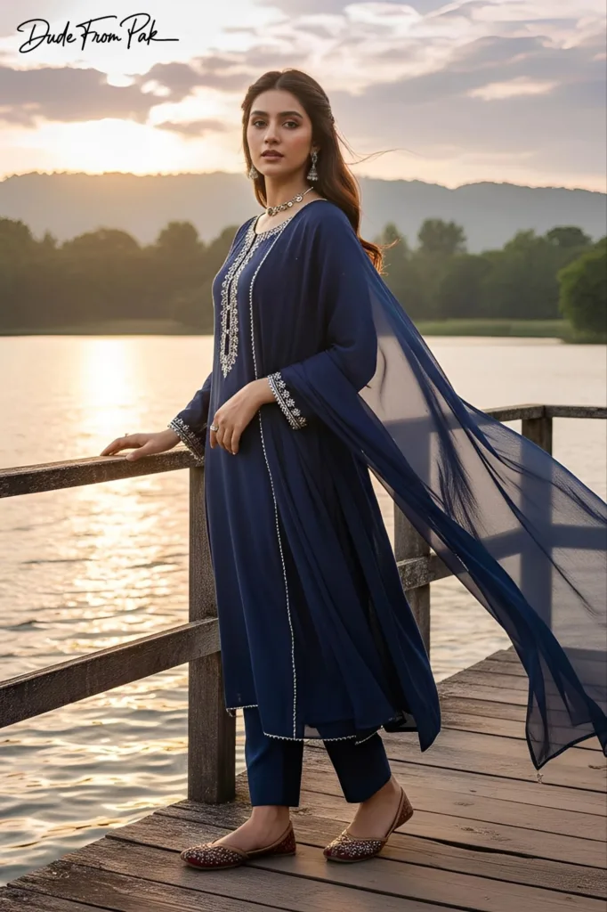 She wears a modern yet traditional Pakistani outfit: a flowing midnight-blue long kurta with delicate silver embroidery on the neckline and cuffs, paired with matching tailored shalwar. A soft chiffon dupatta drapes elegantly over one shoulder and catches the gentle breeze. She completes the look with subtle silver jewelry and traditional khussa shoes.