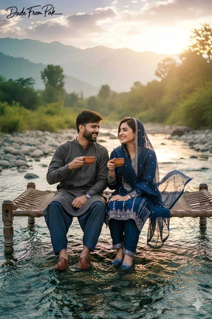 A highly realistic AI prompt depicting a Pakistani couple savoring tea on a charpai situated in a shallow river. Enveloped by golden sunlight, shimmering water reflections, and tranquil mountain vistas, this prompt encapsulates love, joy, and cultural warmth — an ideal narrative backdrop for your upcoming AI creation.
