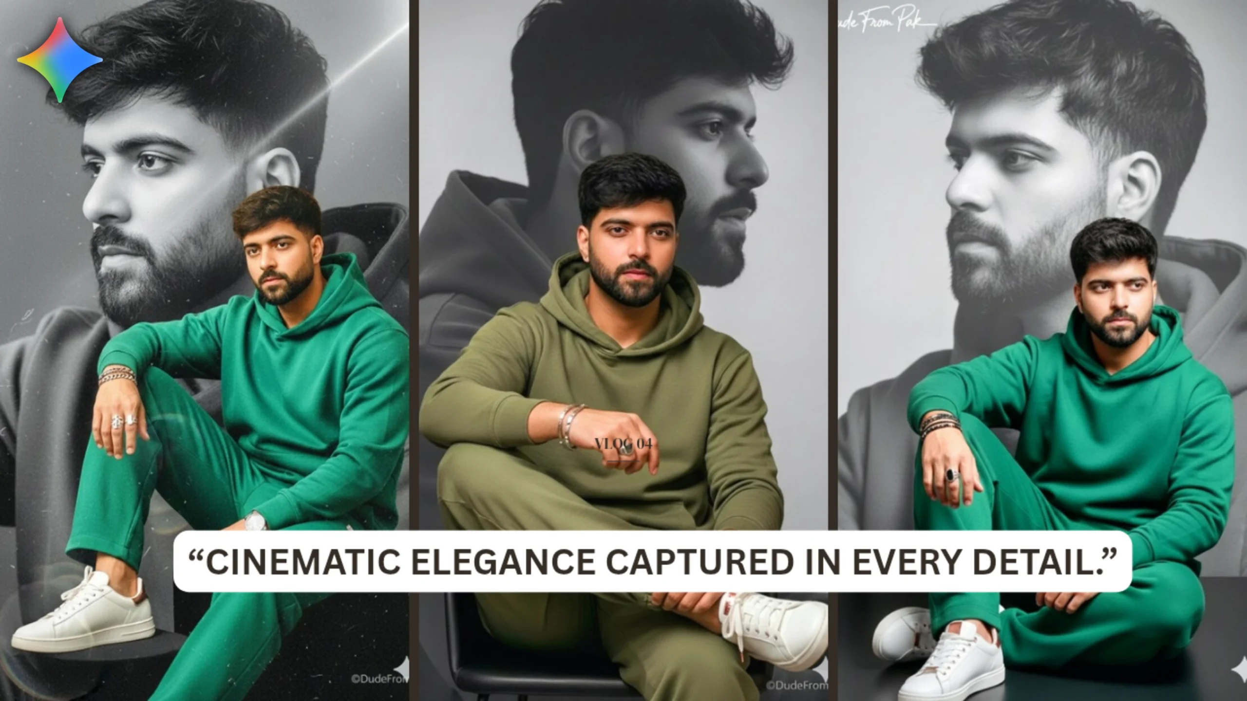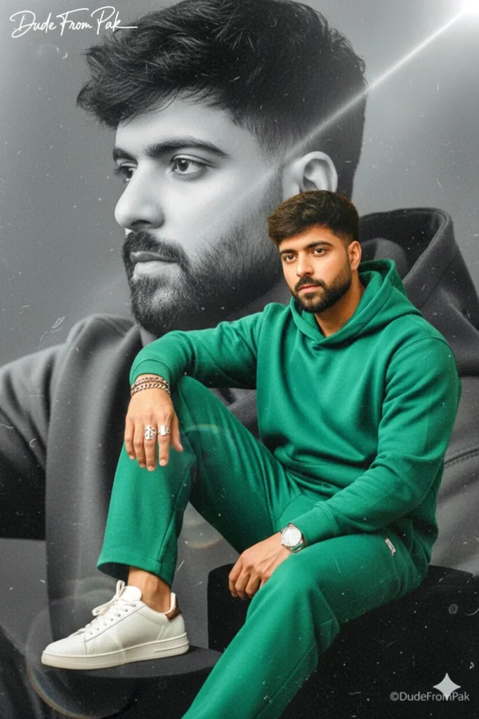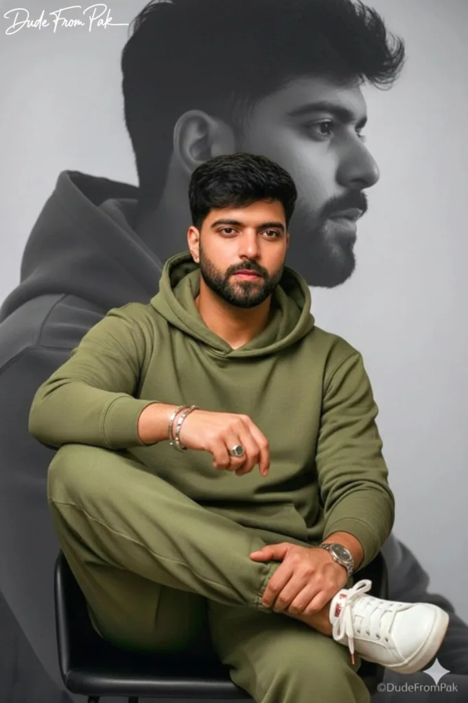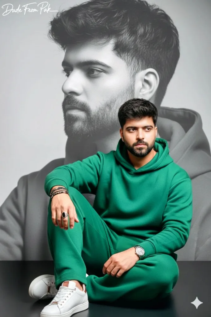 This incredibly lifelike 8K portrait depicts the young man in all his authenticity, with every facial feature, hair strand, and expression captured in a natural manner. Sitting elegantly in a contemporary green hoodie paired with loose-fitting trousers, he radiates a sense of effortless style. Immaculate white sneakers adorned with rose gold details, layered bracelets, and a unique ring contribute to a touch of refined sophistication.