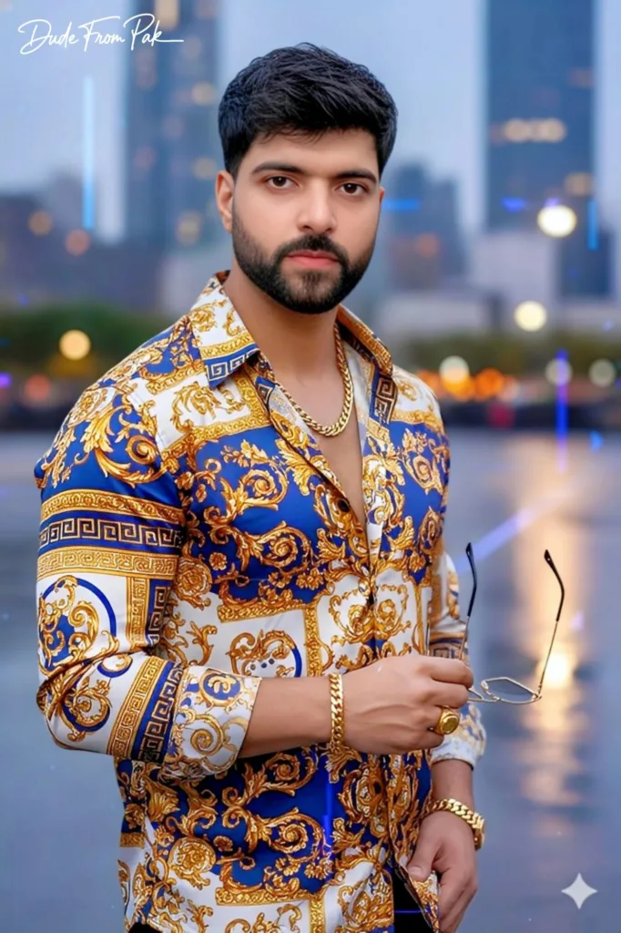 Against a backdrop of a dusky city illuminated by warm bokeh lights, this portrait seamlessly merges fashion with ambiance. The shirt featuring a gold-blue-white pattern, along with reflective accessories and sunglasses held in hand, imparts a luxurious editorial vibe to the image. Delicate rim lighting accentuates his face and shoulders, adding depth and atmosphere. The entire appearance exudes confidence, modernity, and a hint of mystery, making it ideal for a high-fashion moment at twilight.