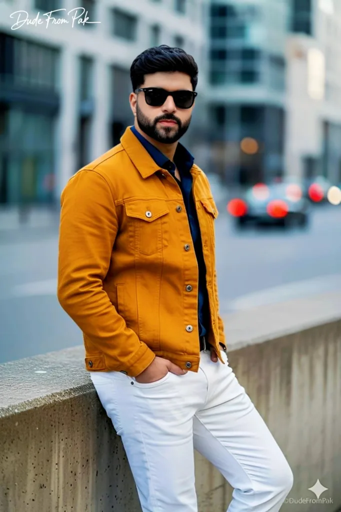 This outdoor portrait highlights a self-assured street-style aesthetic, merging cool urban hues with vibrant fashion shades. The mustard canvas jacket, deep blue shirt, and sharp white trousers form a bold color contrast, while the relaxed stance against a concrete wall adds an effortless flair. With gentle urban bokeh in the backdrop and bright daylight accentuating the textures, this image exudes a contemporary, editorial street vibe.