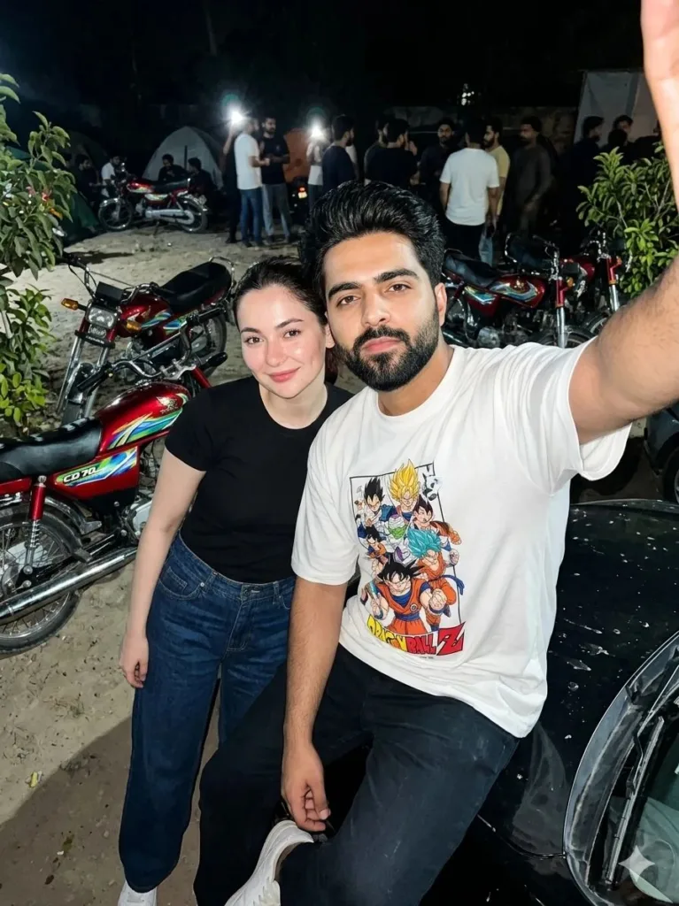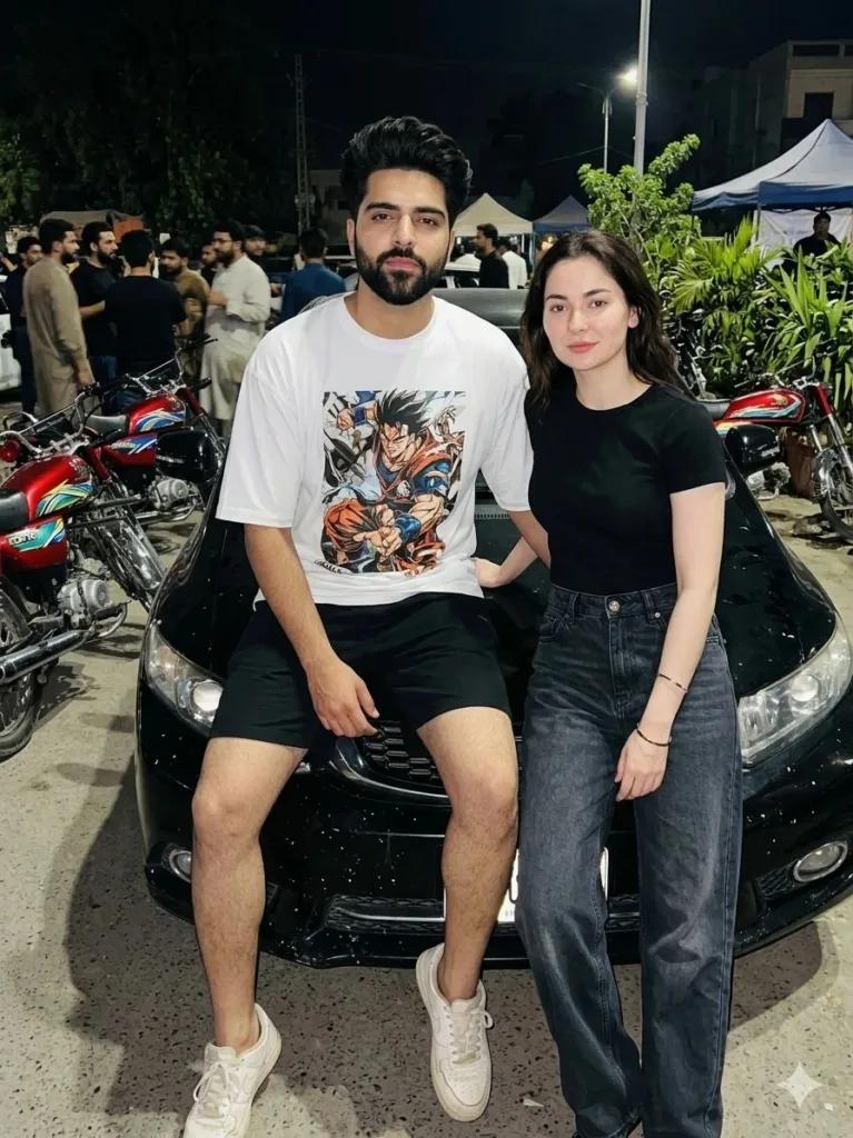 A candid night front-camera selfie of Subject A (male) sitting on the hood of a black car while Subject B (Female) stands close beside him, both naturally leaning into the frame as if capturing a quick moment together. Subject A appears slightly closer to the camera with a calm, confident look, while Subject B has a relaxed soft expression, either smiling lightly or glancing at him. The scene is lit by a bright direct flash that lights their faces and leaves the background darker, with people, bikes, and street activity faintly visible. The overall feel is raw and unposed, with natural skin texture, casual clothing, slight imperfections, and a real smartphone selfie vibe. –ar 9:16
