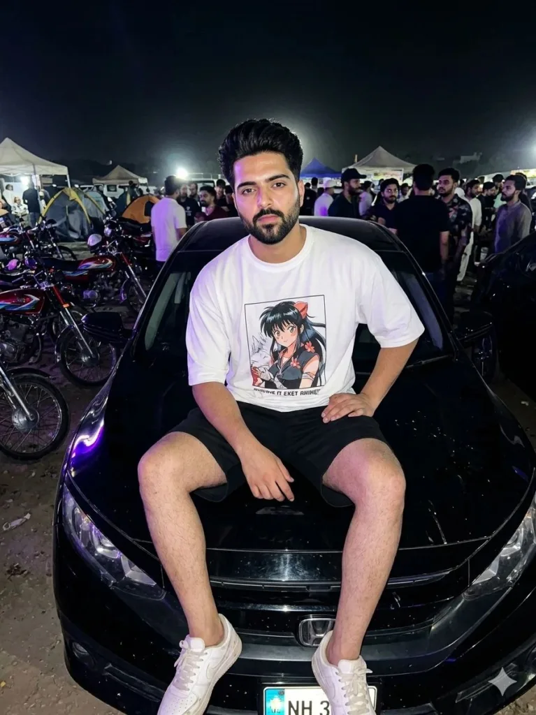 A candid night street photo of Subject A (male) sitting casually on the hood of a black car in a busy outdoor area, relaxed posture with a slight head tilt and calm, confident expression while looking at the camera. The scene is lit with a strong direct flash that brightens him and creates bold shadows, with the background showing people, bikes, and dim surroundings fading into darkness. The moment feels raw and unposed, with natural skin texture, casual clothing, and real-world imperfections like reflections on the car and uneven lighting. –ar 9:16