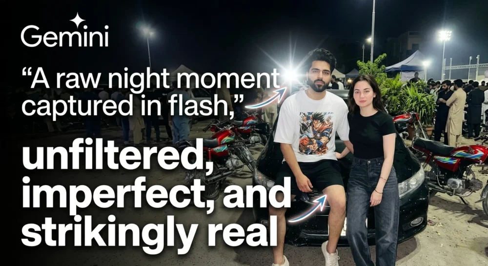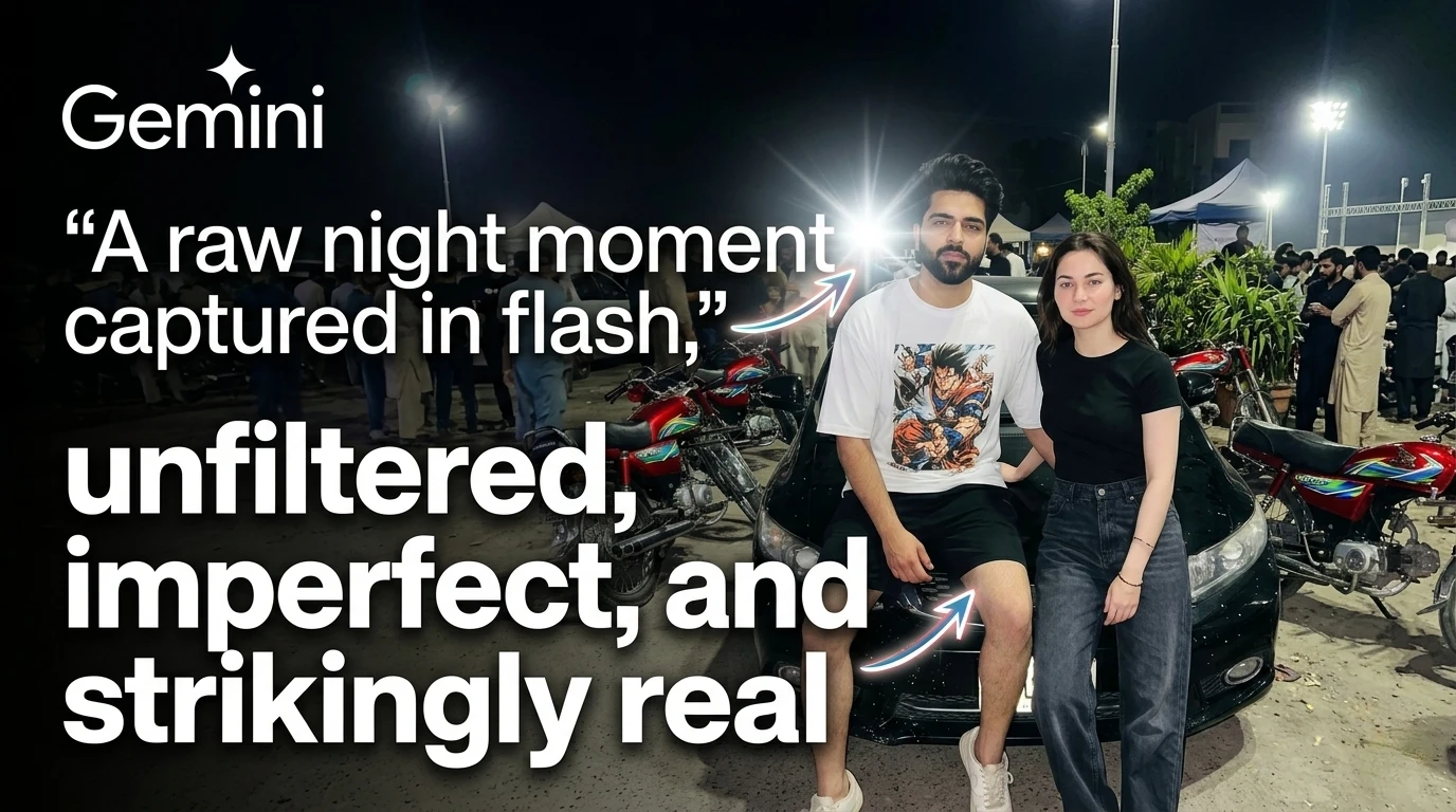 While experimenting with Google Gemini, I started building prompts that mimic raw smartphone photography — especially harsh flash shots, imperfect framing, and natural human interaction. The goal wasn’t to create polished visuals, but to recreate moments that look like they just happened.