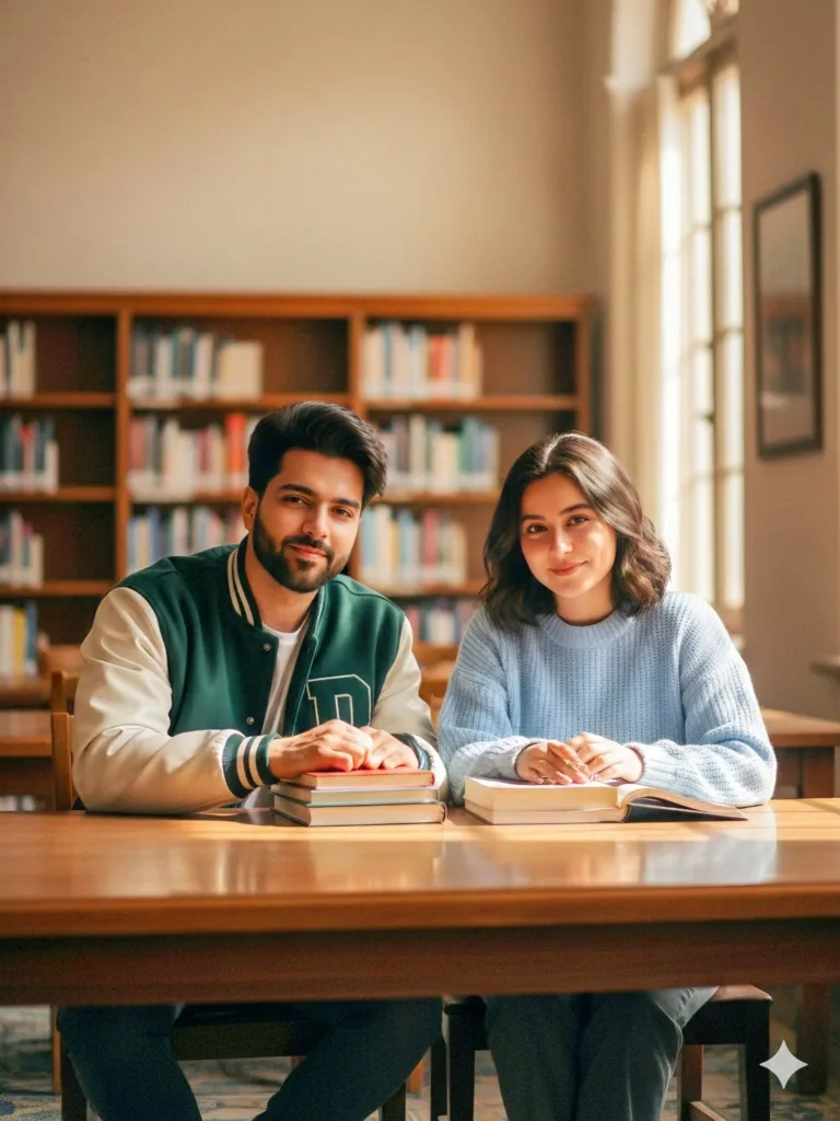 This portrait concept embodies academic elegance and youthful narrative, featuring two students seated together at a sleek library table surrounded by textbooks and sunlight streaming through tall glass windows. The girl sports a soft pastel sweater paired with denim, while the boy dons a varsity jacket over a white tee, perfectly aligning with the campus vibe.
