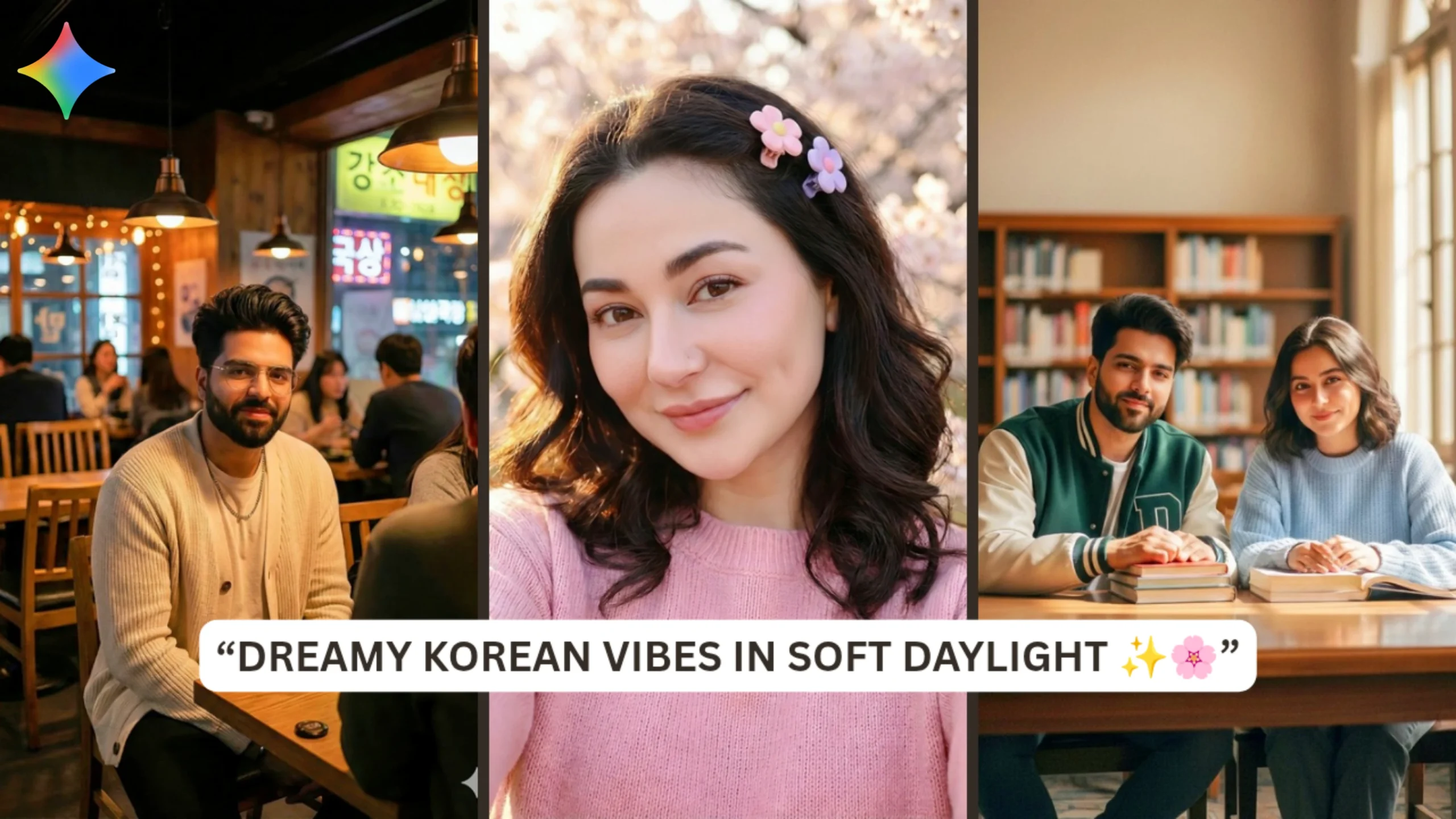 Step into a realm of warm, cinematic portraits that draw inspiration from Korean aesthetics and everyday life experiences. From a whimsical daylight garden adorned with cherry blossoms and gentle K-beauty hues, to a snug late-night café illuminated by tungsten lights and vibrant neon accents, and ultimately, a sun-drenched college library that encapsulates youthful romance and study atmospheres, these portraits seamlessly merge realism with storytelling.