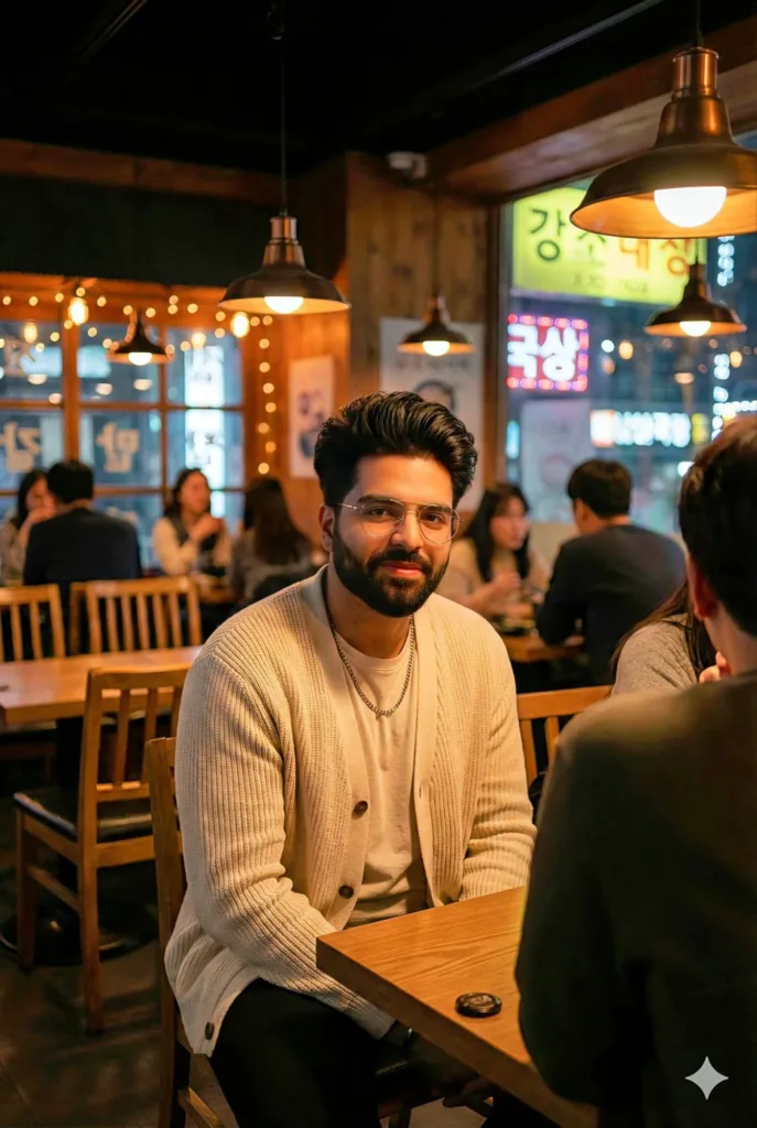 This portrait beautifully conveys the inviting atmosphere of a late-night Korean café, featuring soft lighting, tungsten bulbs, and a snug cinematic aesthetic. The subject sits with a soft smile, dressed in a cream cardigan adorned with delicate silver accents.