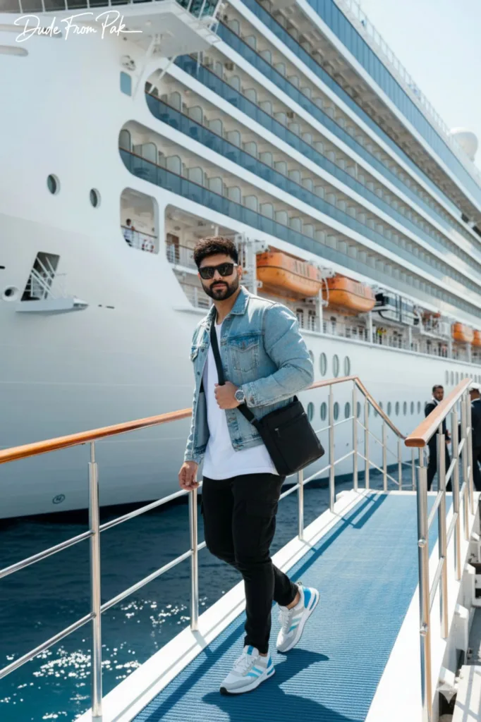 Enter a realm where fashion intertwines with adventure! This AI-created portrait depicts a self-assured young man scaling the side ramp of a radiant luxury cruise ship. Each aspect, from his stylish layered streetwear to the dazzling deck and glistening ocean, exudes an ultra-realistic and cinematic quality.