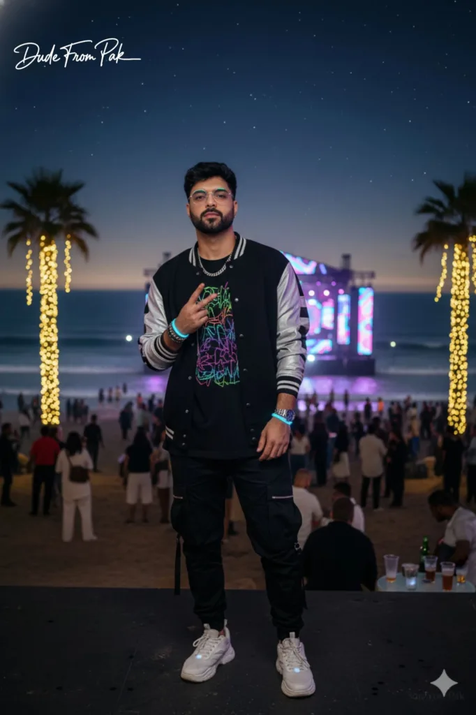 The ocean horizon glows faintly, merging with the night sky dotted with stars. The lighting feels cinematic and dynamic, blending urban energy with coastal nightlife. The photo evokes a stylish, youthful, and electrifying vibe—a perfect mix of fashion, music, and freedom. -ar 9:16