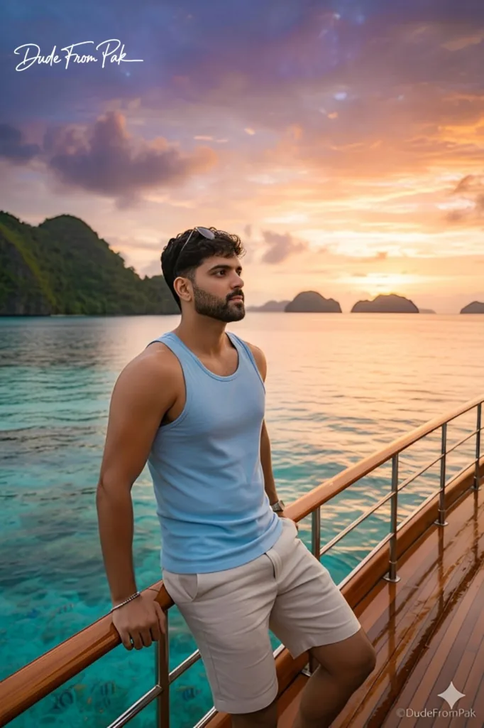 In the distance, lush green limestone islands frame the horizon under a sky painted with vivid sunset clouds. Gentle waves lap against the yacht, and subtle sun flares and soft shadows highlight the contours of his face and body.