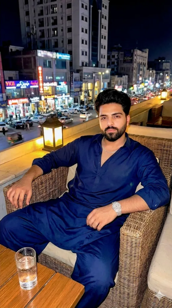 “A handsome young Pakistani man lounges on a modern rattan chair on a rooftop at night, overlooking the bustling streets of Lahore with neon signs and tall buildings in the distance. He wears a deep navy Shalwar Kameez with two buttons undone, a shining silver necklace, and a diamond wristwatch. One hand rests on his thigh, the other on the armrest, facing the camera with a calm, suave expression. Face remains identical to reference image. A gentle night breeze slightly moves the hem of his Shalwar Kameez. A small wooden table in front holds a clear glass of soda. Warm lantern light softly illuminates his face, casting realistic shadows. Ultra-realistic 8K textures: fabric folds, skin, hair, jewelry reflections, city activity fully visible, no blur, no bokeh, TikTok vertical 9:16.”