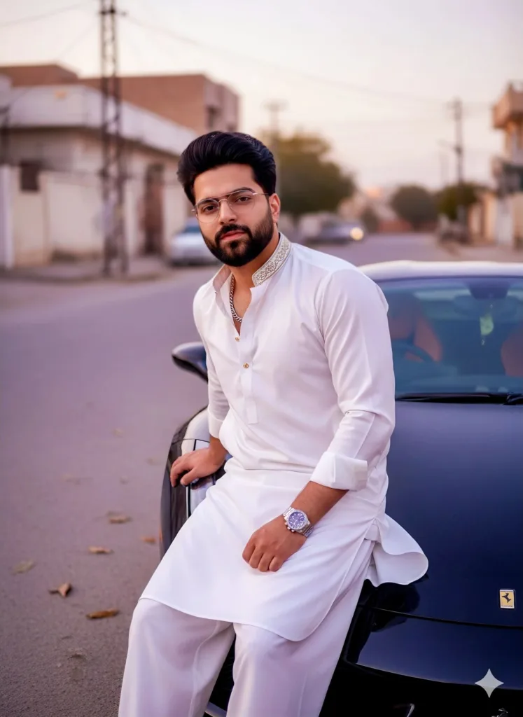 Immerse yourself in a cinematic evening in Karachi, where AI infuses style into reality. A young man leans effortlessly against the hood of a sleek black luxury sports car, dressed in a pristine white Shalwar Kameez adorned with gold embroidery. The warm hues of the sunset illuminate the street, scattered leaves, and reflective surfaces, while his assured smirk and opulent accessories gleam in stunning ultra-realistic 8K detail. Ideal for vertical social media posts that highlight contemporary fashion and sophistication.