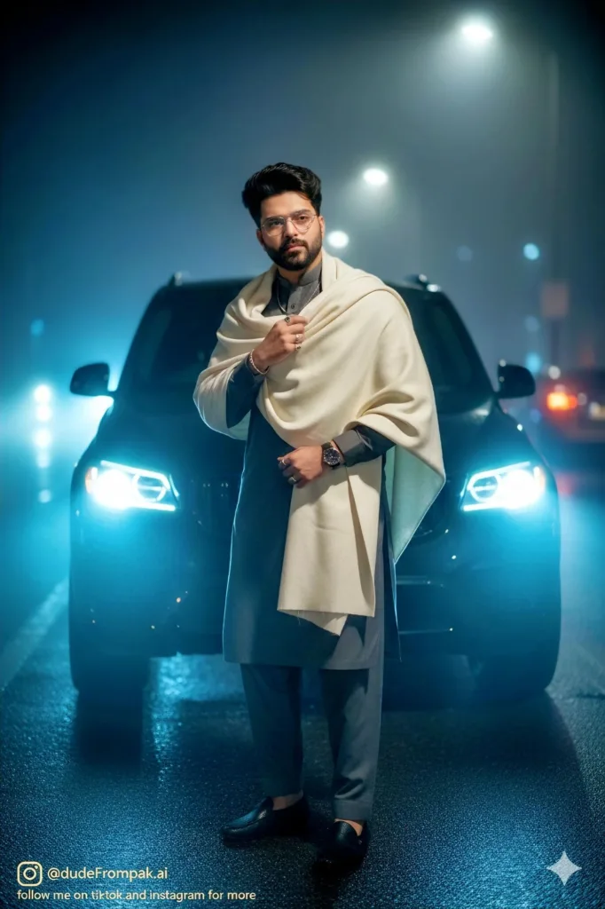 Enter the realm of hyper-realistic AI-generated portraits, where every nuance from the draping of fabrics and the shimmer of jewelry to the glow of city lights and the caress of evening breezes is vividly depicted. Observe a fashionable young Pakistani man as he relaxes on rooftops, leans effortlessly against luxury vehicles, and showcases winter outfits with cinematic flair. Ideal for TikTok verticals, Instagram feeds, and anyone captivated by contemporary fashion, photography, and the creativity of AI. Each image is produced in breathtaking 8K–16K resolution, portraying lifelike skin, hair, and textures that seem almost real. Join him on his journey through Lahore and Karachi, and witness how AI artistry transforms ordinary moments into extraordinary visual narratives.