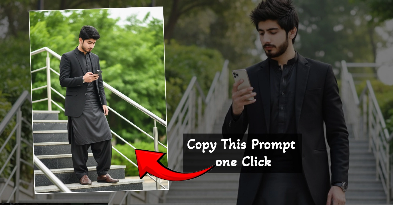 Use my face and create a pic A young man with same hair, wearing black silk shalwar gameez and wear black blazer coat on qameez and brown loafers stands on a modern outdoor staircase with silver railings. He is holding Mobile in his right hand and looking mobile. The background features lush green foliage suggesting an outdoor park or garden setting. The lighting is bright and natural, highlighting the textures of his clothing and the details of the staircase don’t change the face