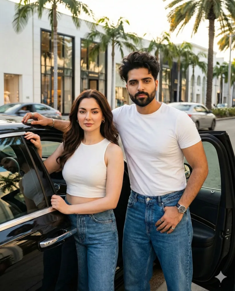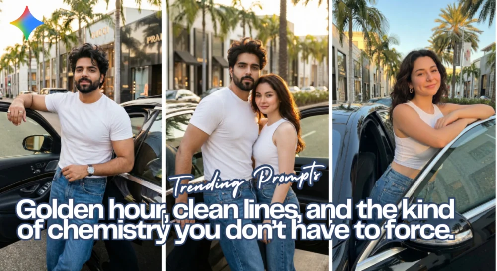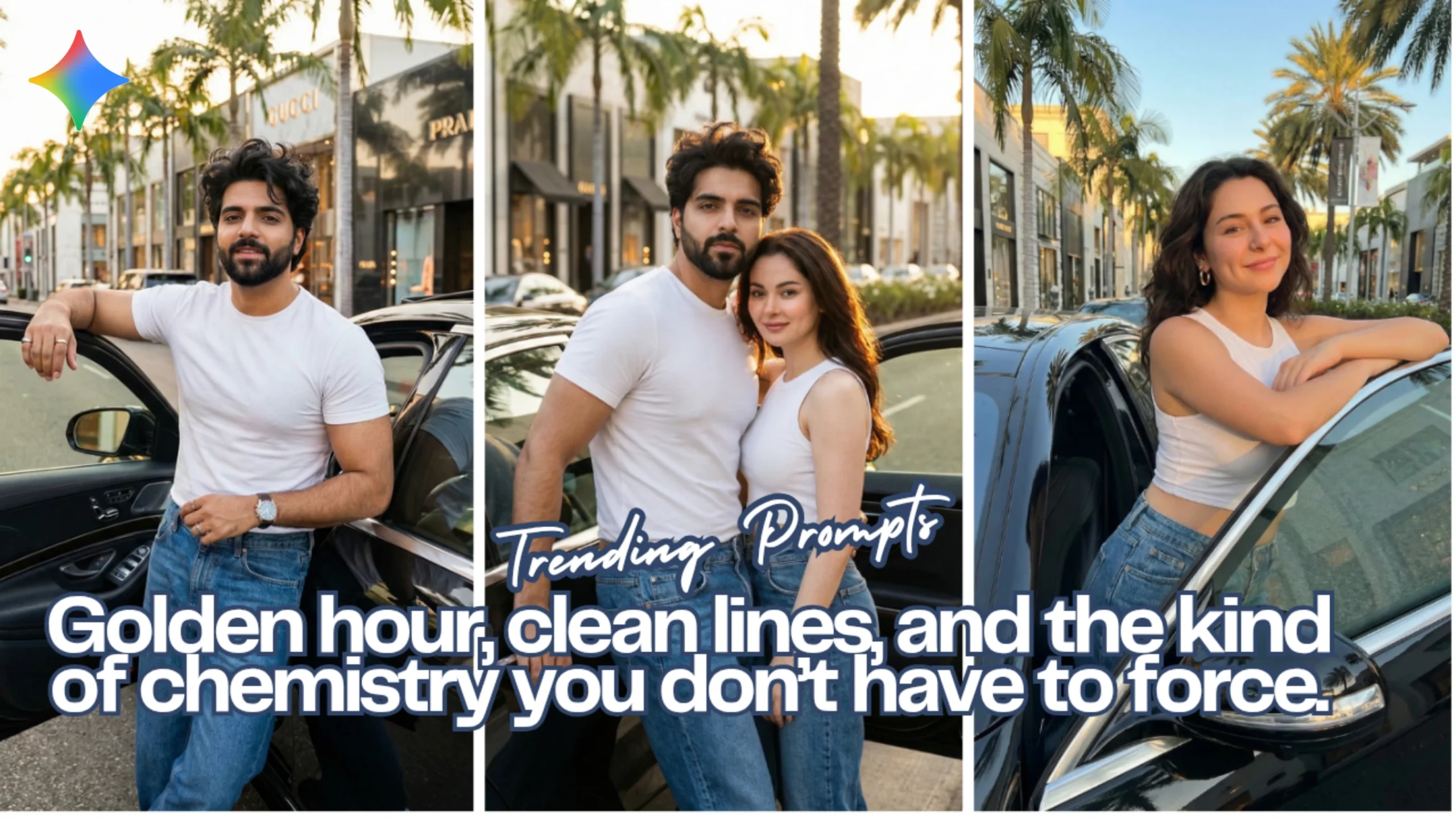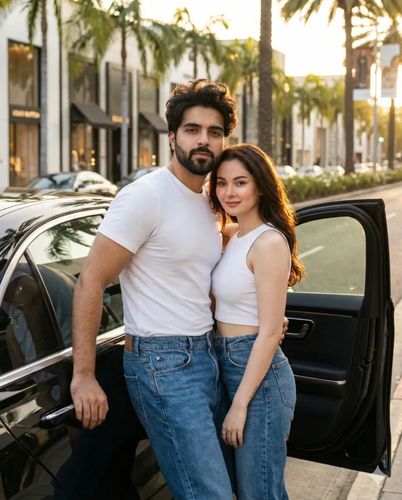 Ultra-realistic luxury street editorial of a young couple positioned side by side against an open black luxury sedan on a palm-lined designer shopping boulevard at golden hour.