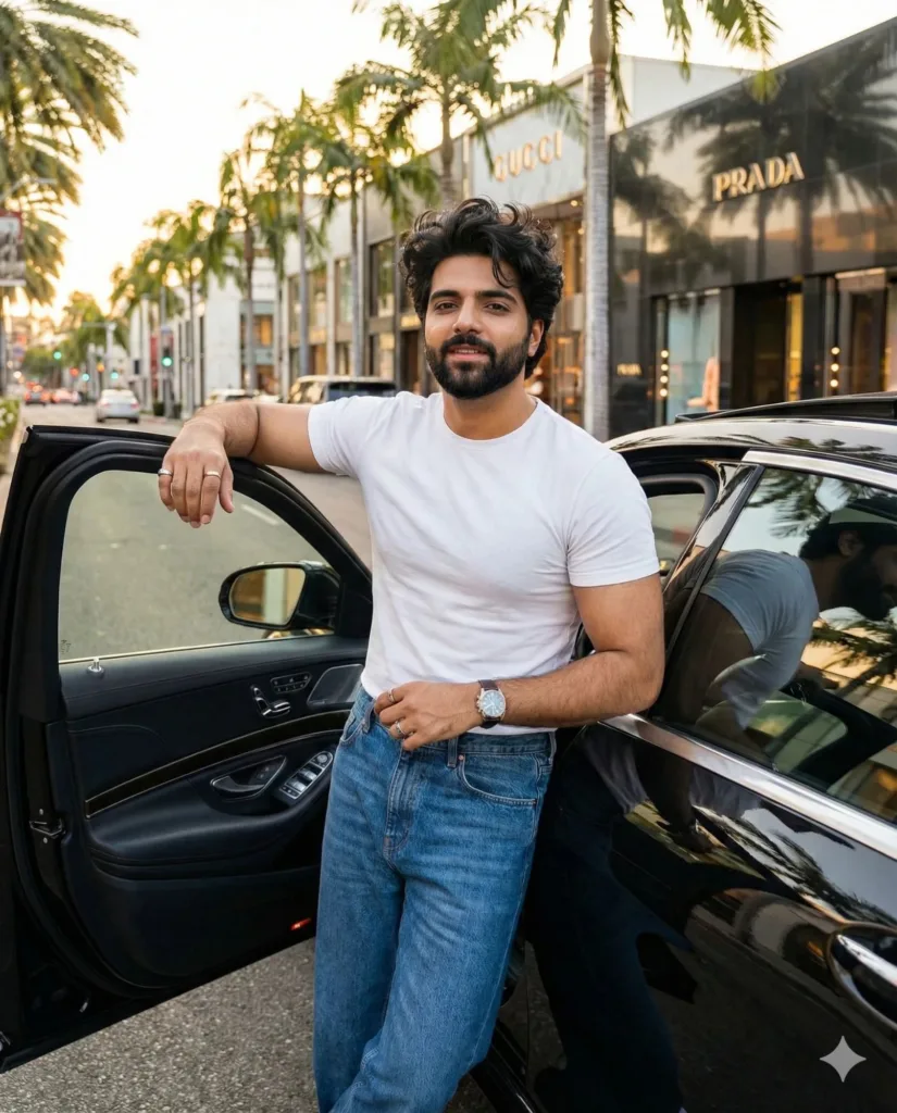 Ultra-realistic lifestyle street photography of a confident young man leaning against an open black luxury sedan door on a palm-lined designer shopping street at golden hour. He has messy volumised hair, trimmed beard, chiseled jawline, no glasses, texture, raw skin detail. He wears a fitted white t-shirt with premium fabric and high-waisted blue jeans, minimal accessories, wristwatch and rings.