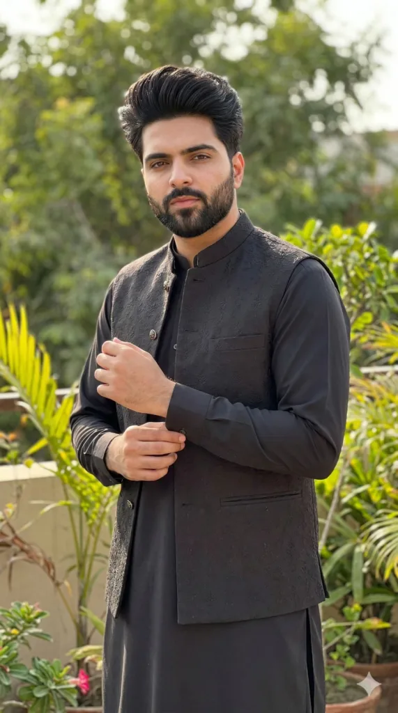 Young Pakistani male (hard identity locked) standing naturally on a terrace, slight torso twist, right hand adjusting cuff, left relaxed, head turned with confident gaze, unposed expression. Wearing off-black shalwar kameez with subtle embroidered waistcoat, natural fabric folds and motion. No glasses. Hair, face, and beard exactly as reference. Terrace background with greenery softly blurred, sunlight creating uneven highlights and natural shadows. Raw, handheld iPhone snapshot, true colors, natural skin texture, minor motion softness.