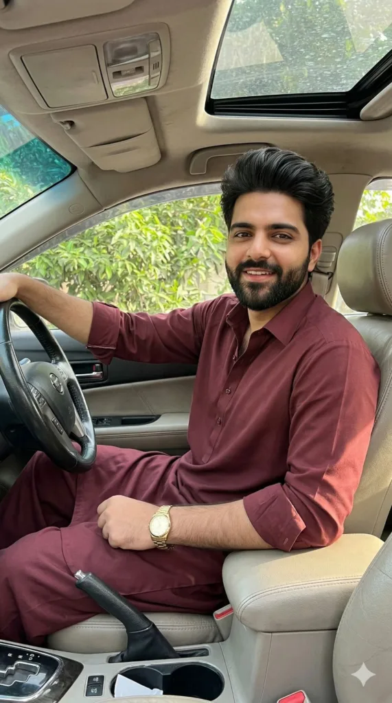 Young Pakistani male sitting in the driver’s seat of a car, captured in a spontaneous moment. Portrait 9:16, slightly tilted and off-center, handheld iPhone shot. Left hand resting on armrest, right hand loosely on steering wheel, relaxed posture, natural gaze — unposed expression. Wearing a maroon Shalwar Kamiz with premium fabric, 2 buttons open, sleeves casually rolled, gold watch visible, no glasses. Clothes show natural folds, slightly imperfect. Car interior looks real and used leather seats, center console, subtle reflections, not overly clean or staged. Daylight enters unevenly through windows/sunroof, creating soft highlights and inconsistent shadows. Outside greenery visible through windows with minimal natural blur (no artificial bokeh). Slight reflections and glare on glass. True iPhone colors, natural skin texture, minor exposure inconsistencies, slight motion softness. Raw, unfiltered, accidental snapshot feel — not cinematic or staged. Face and details unchanged.