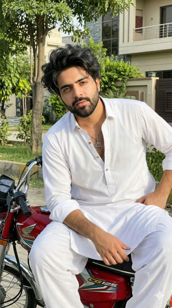 Young Pakistani male sitting backwards on a Honda CG 125 bike outdoors, captured in a spontaneous moment. Portrait 9:16, slightly tilted and off-center, handheld iPhone shot. Relaxed posture, one arm resting, head slightly tilted down or sideways, natural gaze toward camera — unposed expression. Wearing a white shalwar kameez with top 2 buttons open, realistic folds. “Allah” pendant visible on chest catching uneven light. Hair slightly messy, beard natural. Bike looks real and casually placed with natural reflections. Background greenery with minimal natural blur (no artificial bokeh). Warm sunlight creates uneven highlights, slight overexposure, and soft shadow inconsistencies. True iPhone colors, natural skin texture, slight motion softness. Raw, unfiltered, accidental snapshot feel — not cinematic or staged.