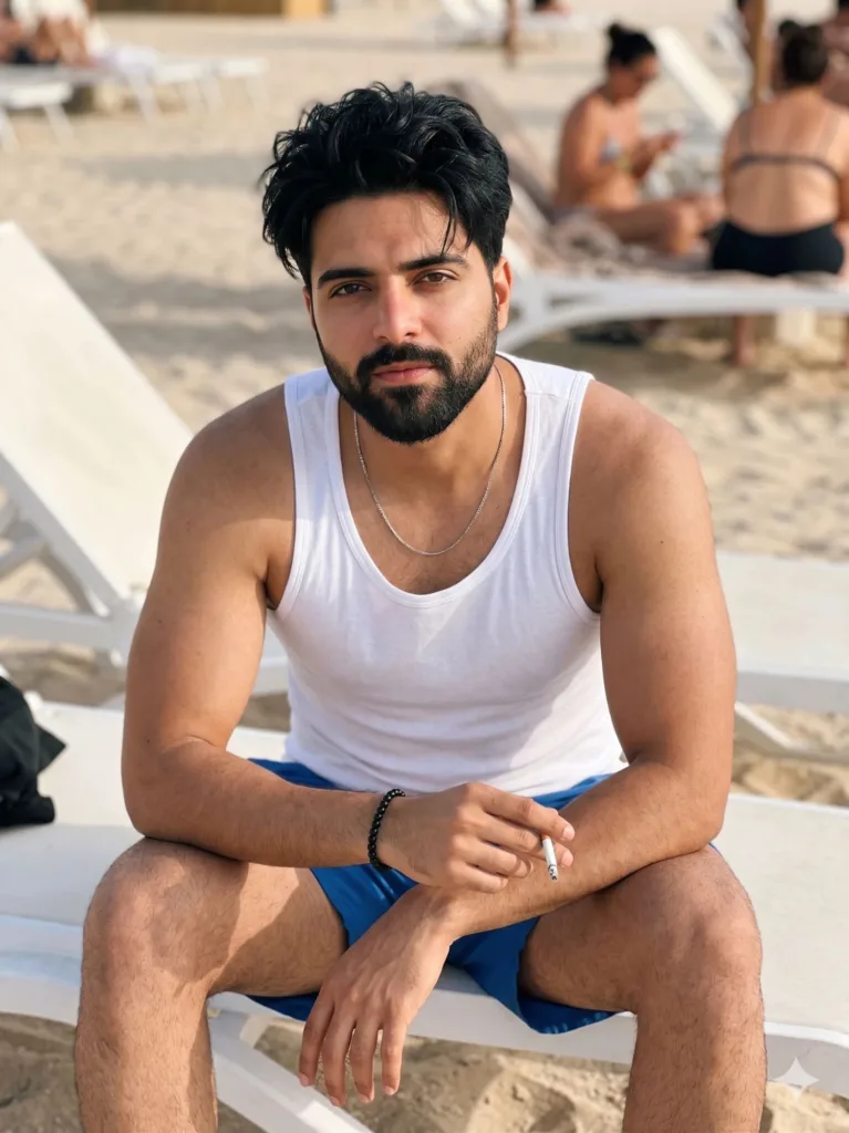 Ultra-realistic iPhone-style photo using the uploaded face as the only identity source, preserving exact facial features, skin tone, and natural imperfections (no alteration, no beautification), young South Asian man with a tall athletic V-shaped physique, naturally defined arms and shoulders (lean, not bulky), slightly messy black hair falling naturally, no tattoos