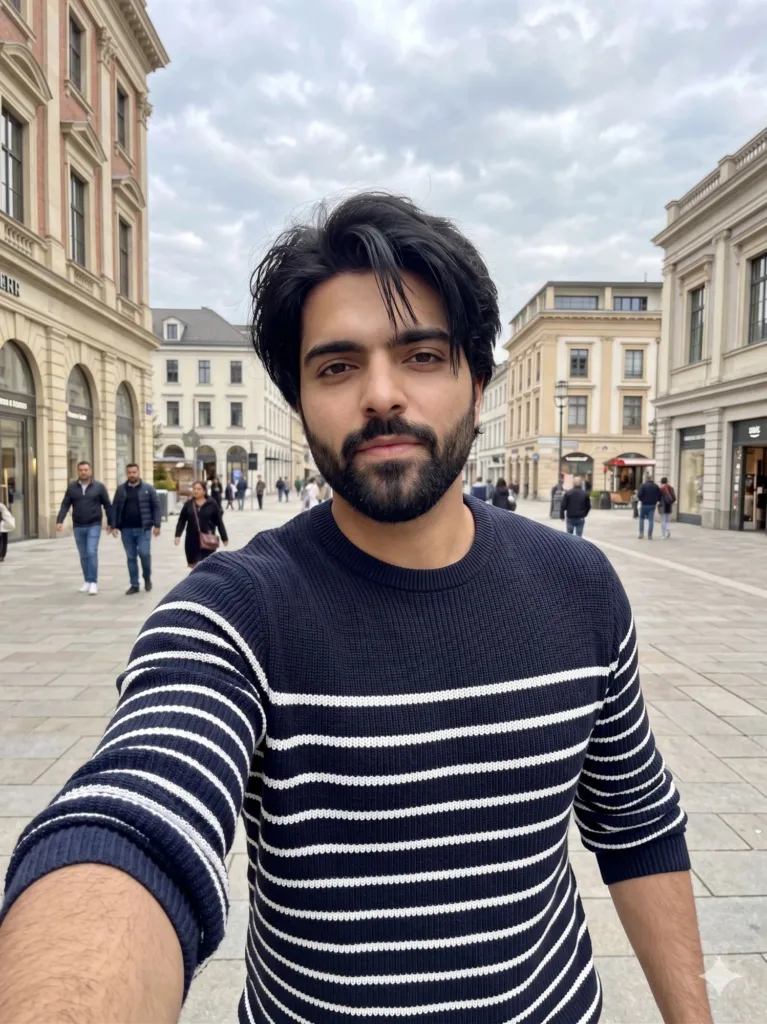 Ultra-realistic iPhone front camera selfie (no phone visible) using the uploaded face as the only identity source, preserving exact facial features, skin tone and natural imperfections, young South Asian man with a tall athletic V-shaped physique and naturally defined arms, healthy skin with subtle texture, black medium-length slightly messy hair falling over forehead, no tattoos, no glasses, walking casually in an open plaza in Islamabad with European-style architecture influence, cloudy sky creating soft diffused daylight and mild shadows, wearing a dark navy long-sleeve knit sweater with horizontal white stripes, slightly fitted with natural fabric stretch around forearms, holding phone at arm’s length in a moving selfie angle, upper body slightly leaning forward mid-step, relaxed posture, direct eye contact with a calm confident expression, slight motion blur in background from walking, people passing behind in natural movement, environment fully sharp (no portrait mode), slightly off-center imperfect framing, mild lens softness, neutral tone no heavy grading, raw candid iPhone snapshot, realistic and unposed –ar 3:4 –style raw –v 6 –q 2