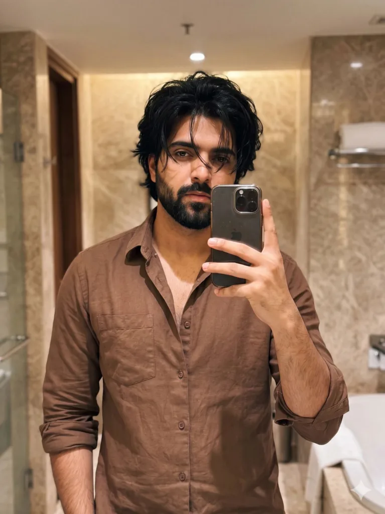 Ultra-realistic mirror selfie using the uploaded face as the only identity reference, preserving exact facial features, skin tone, and natural imperfections, young South Asian man with a tall athletic V-shaped physique and naturally defined arms, no glasses, healthy skin with subtle real texture (fine pores, slight unevenness, no artificial smoothing), clean natural look, no tattoos