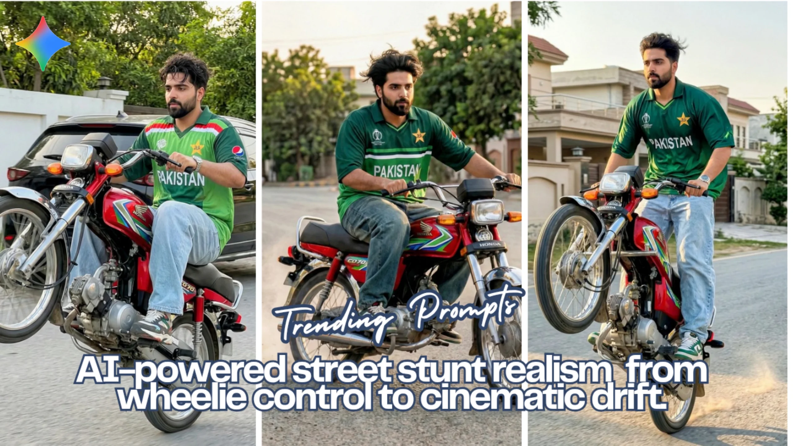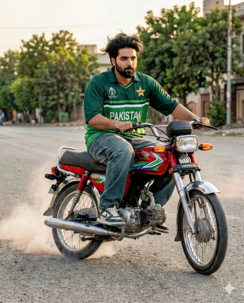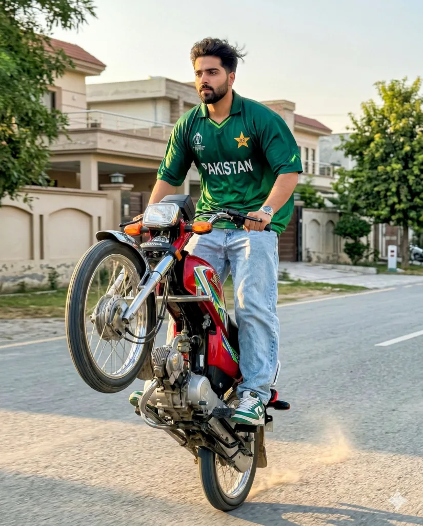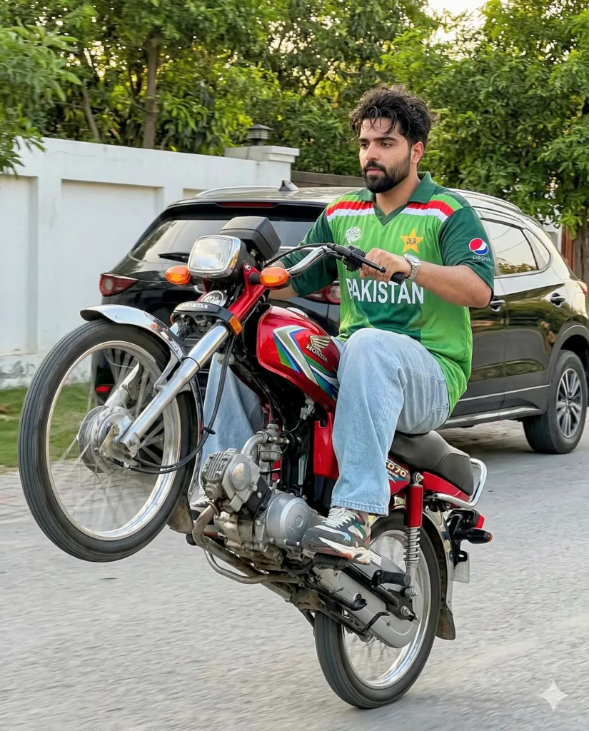 Ultra-realistic handheld smartphone photo of a stylish young South Asian man (use reference face exactly) doing a one-wheel stunt on a classic Honda CD 70 on a residential street messy volumised hair, trimmed beard, oversized Pakistan cricket jersey, baggy jeans, sneakers warm late afternoon light, slight motion blur on rear wheel, natural skin texture, no beautification or artificial effects.