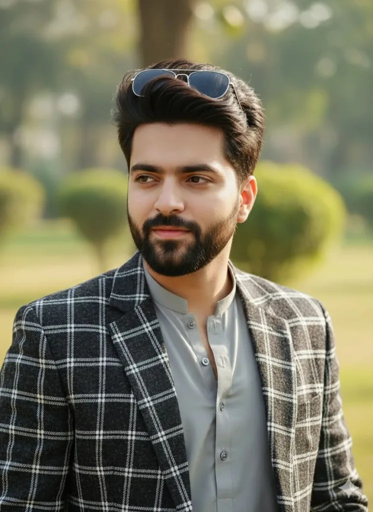 Create an ultra-realistic portrait of a young Pakistani man with messy voluminous hair, fair skin, and expressive brown eyes and a trimmed well-kept beard. He is wearing Stylish grey shalwar kamiz 2 buttons open and black-and-white plaid blazer which enhances his style and personality. Sunglasses are perched on top of his head. The outdoor setting is a park with lush green trees and grass in the background, natural sunlight illuminating the scene. The man is posing for a close-up shot, looking slightly to the side with a soft expression. 3:4