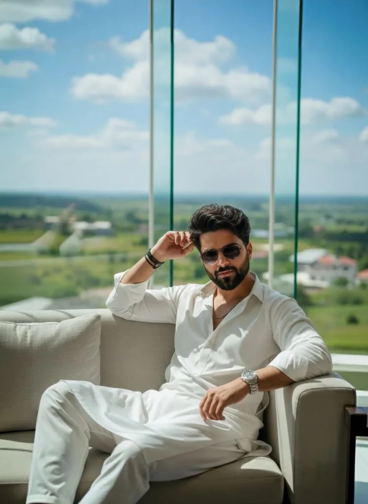 This portrait depicts a fashionable Pakistani man enjoying a serene moment of relaxation, comfortably seated on a couch next to a large glass window. The outside view — rolling green hills, scattered homes, and a bright blue sky adorned with soft clouds — contributes a sense of openness and tranquility to the scene. He is dressed in a crisp white shalwar kameez with open buttons, complemented by subtle silver jewelry and a diamond wristwatch, creating a harmonious blend of tradition and contemporary luxury.